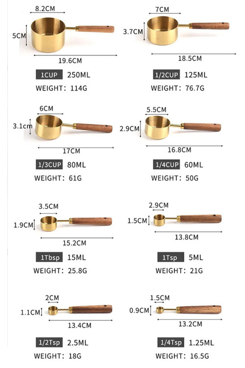 Kitchen Beauty 8 Adet Gold Paslanmaz Çelik Ahşap Saplı Ölçü Kaşığı Seti Ölçü Kabı Seti