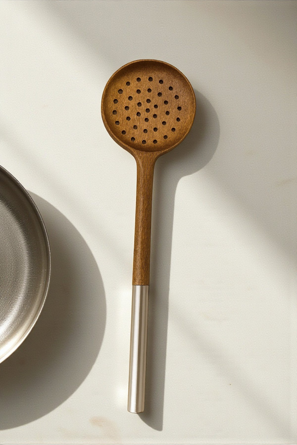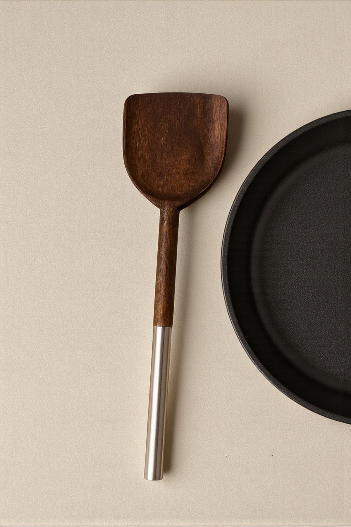 طراحی ساده و رنگ قهوهای طبیعی آن، جلوهای گرم و مینیمال به آشپزخانه شما میبخشد و استفاده از آن برای انواع ظروف، بهویژه قابلمهها و تابههای نچسب، کاملاً مناسب است.